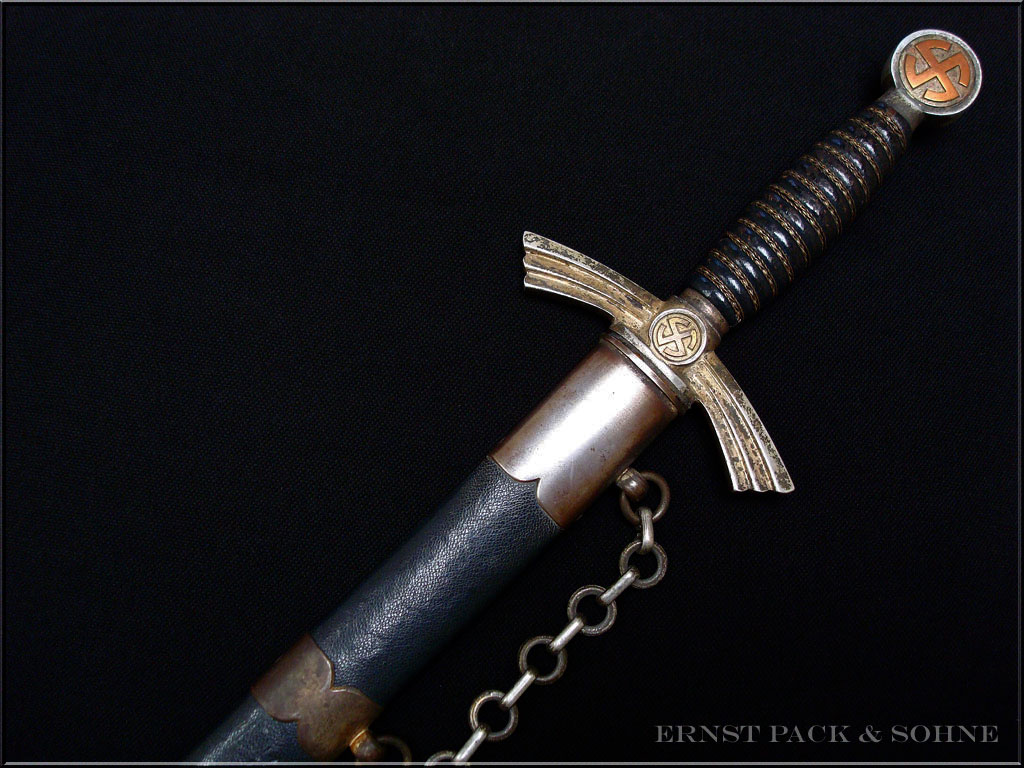 Ernst Pack & Sohne - Traces of gilding & lacquer present - Brass medallion inserts on pommel - Clip marked OLC & Ges. Gesch